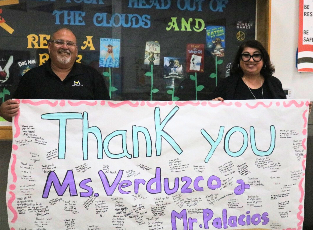 Left to right: Sierra Vista Middle School Counselors Martin Palacios and Maribel Verduzco take a group photo with a recognition banner.